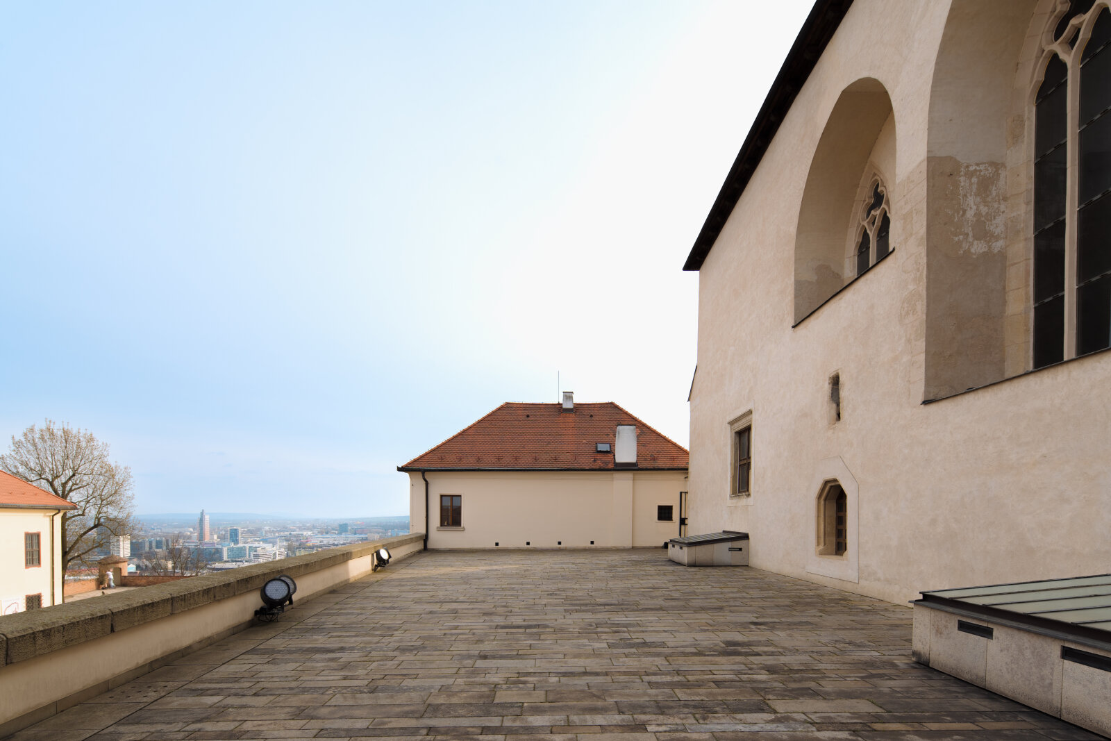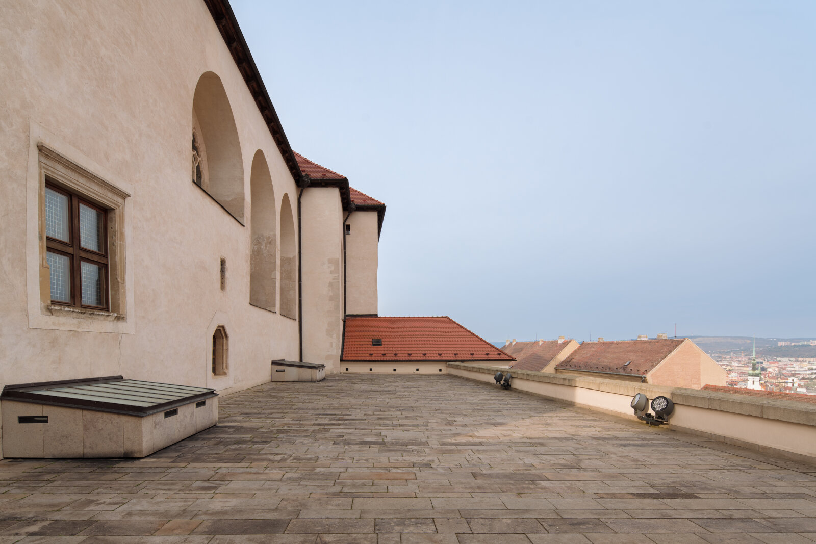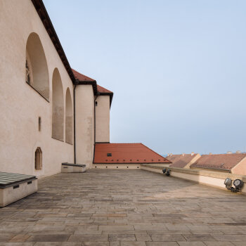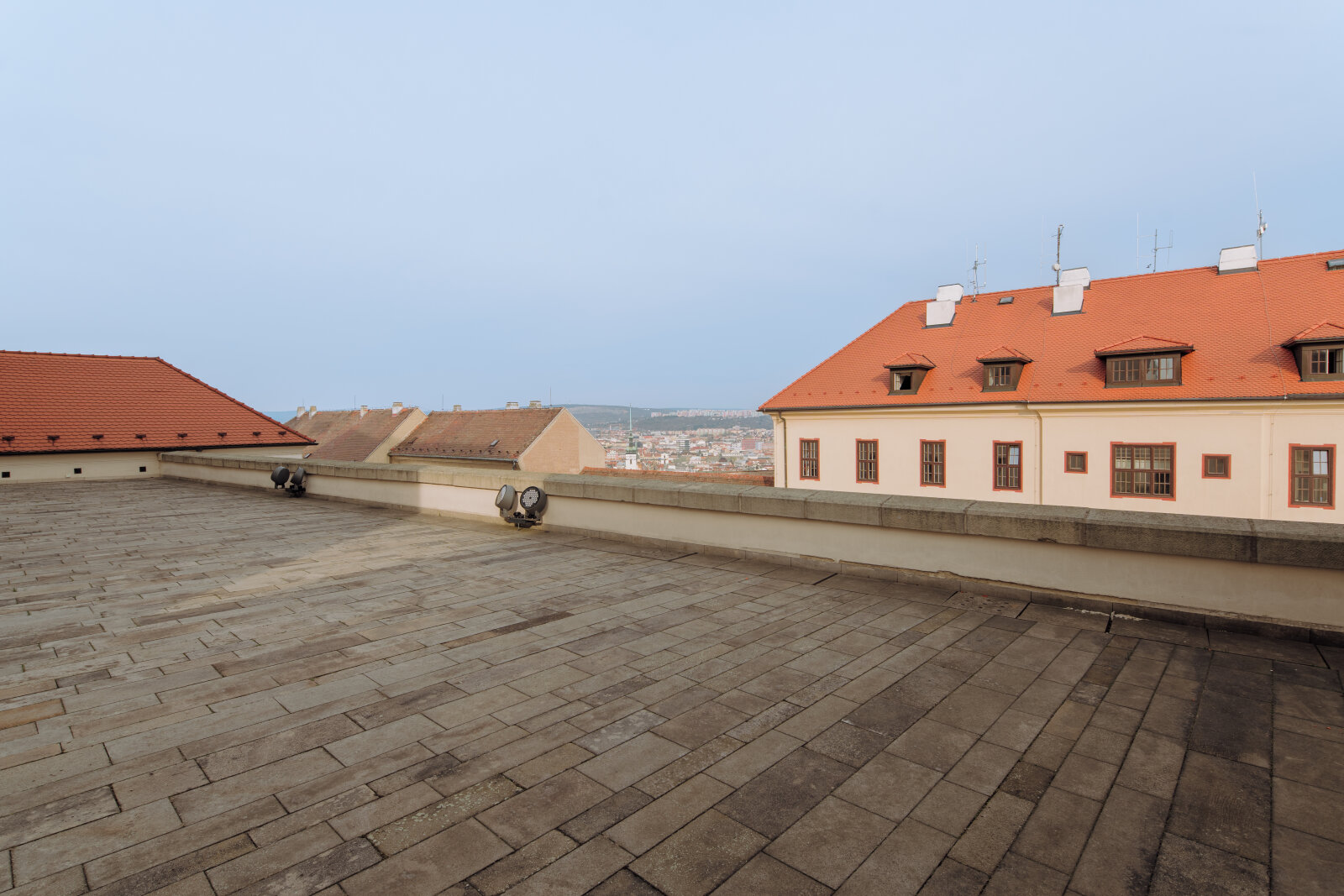 Slunná terasa s výhledem na město pro letní recepce a večírky.