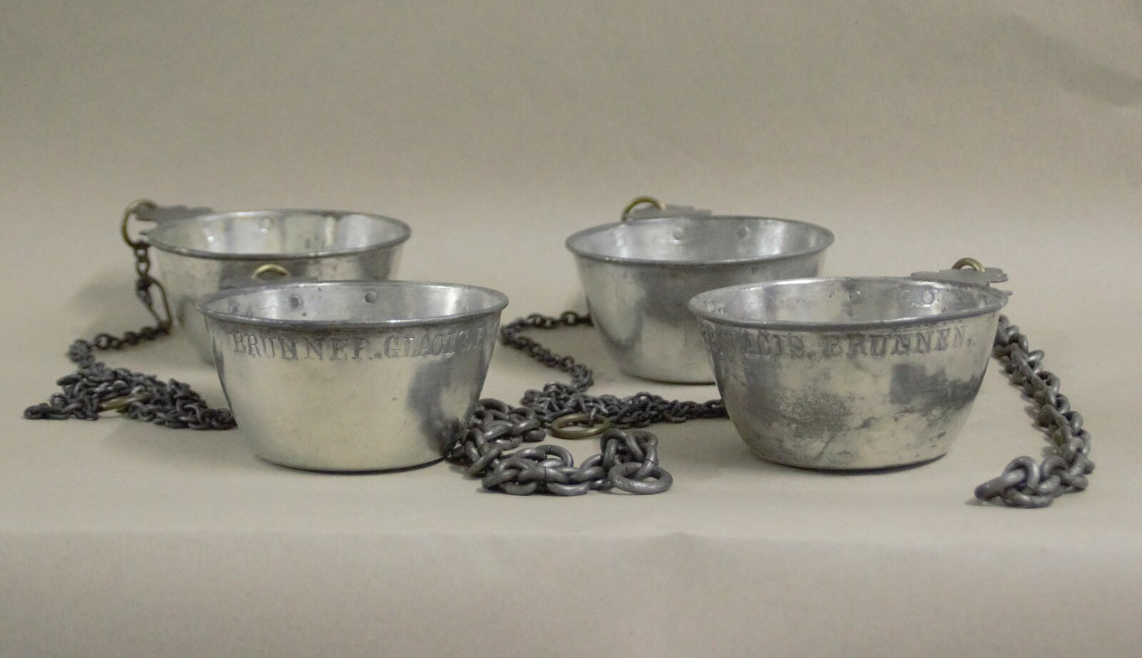 3. Plechové pohárky na vodu z Wawrovy kašny, sbírka Muzea města Brna