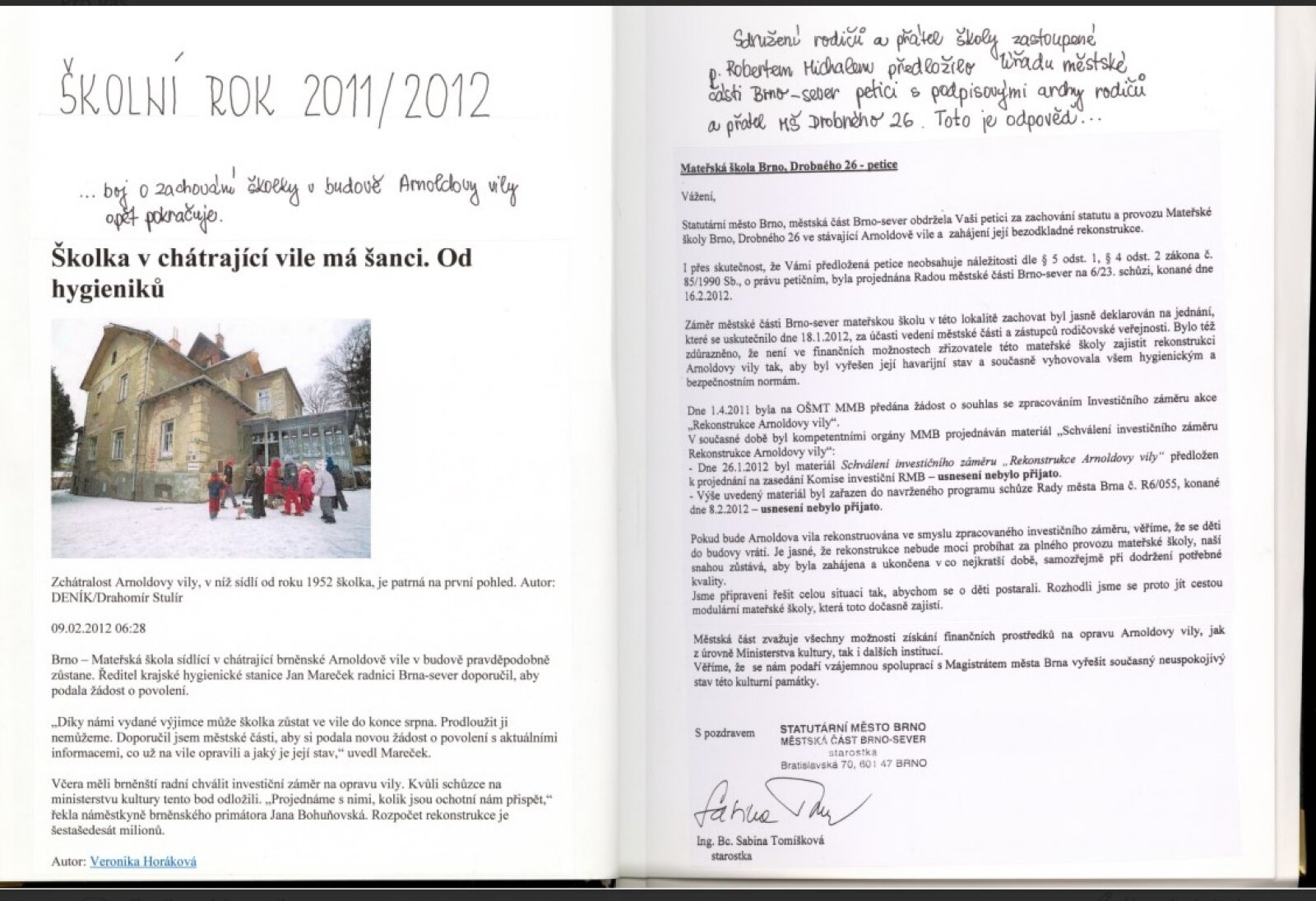 Rodiče se zorganizovali v rámci Sdružení rodičů a přátel školy, vedli i vlastní webové a Facebookové stránky. Jejich sdružení se účastnilo jednání s městskou částí Brno-sever a magistrátem. Mimo jiné organizovali petiční akce (celkem jich bylo pět!) za zachování školky a opravu vily, a zejména v letech 2010 a 2012 byl případ i masivně medializován. Unikátním rysem této iniciativy bylo zapojení rodičů-expertů (architektů, statiků, stavařů), kteří se postavili proti statickému posudku zadanému městem konstatujícímu havarijní stav a nechali na své náklady vypracovat revizní posudek odborníky z VUT. Ten zpochybnil městem deklarovaný katastrofický scénář. Dále tedy na vlastní náklady vypracovali projekt na modernizaci sociálního zařízení, aby vyhovělo hygienickým normám. Byli ochotni úpravy sociálek zčásti financovat z vlastních darů, i je realizovat svépomocí. Nicméně, tyto nabídky nebyly vyslyšeny, a navzdory politickým slibům o výstavbě náhradní modulární školky nad vilou, a proklamovanému zájmu o záchranu památky, byla mateřská škola v létě 2012 definitivně vystěhována.